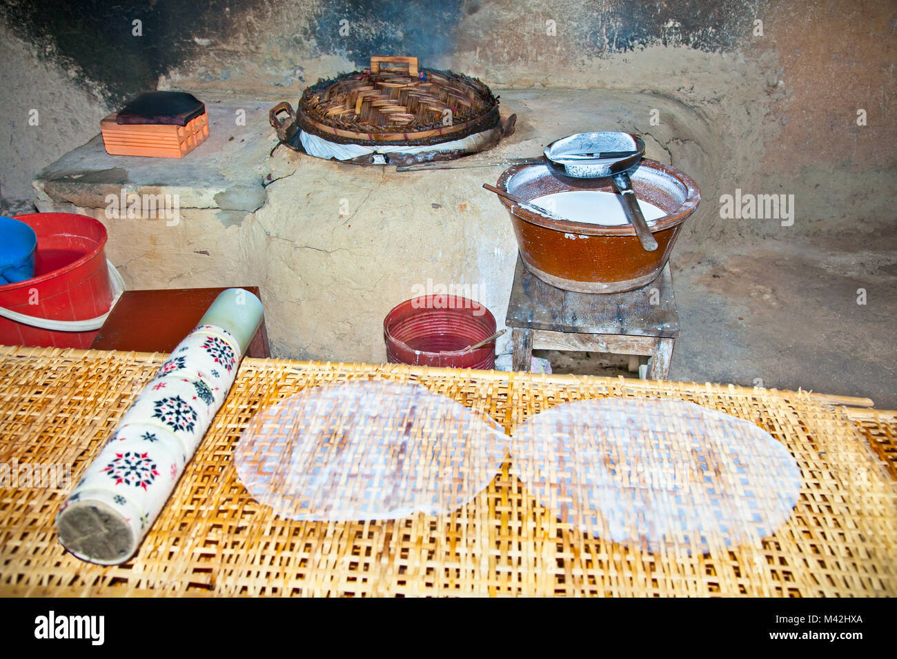 The kitchen where is prepared traditional rice paper pancakes in Cu Chi