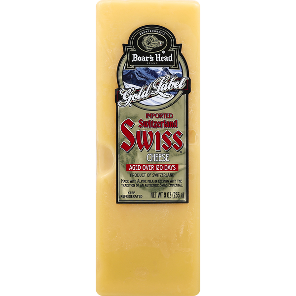 Boar's Head Swiss Cheese, Switzerland, Imported, Gold Label (9 oz) from Boar's Head Imported Swiss Cheese boar's head imported switzerland swiss cheese is made with milk from cows not treated with rbst*. boar's head imported switzerland swiss cheese is aged more than 120 days to produce a bold taste, rich color and smooth texture. Available sliced fresh in the deli. boar's head imported switzerland swiss® cheese is aged more than 120 days to. Boar's Head Imported Swiss Cheese.