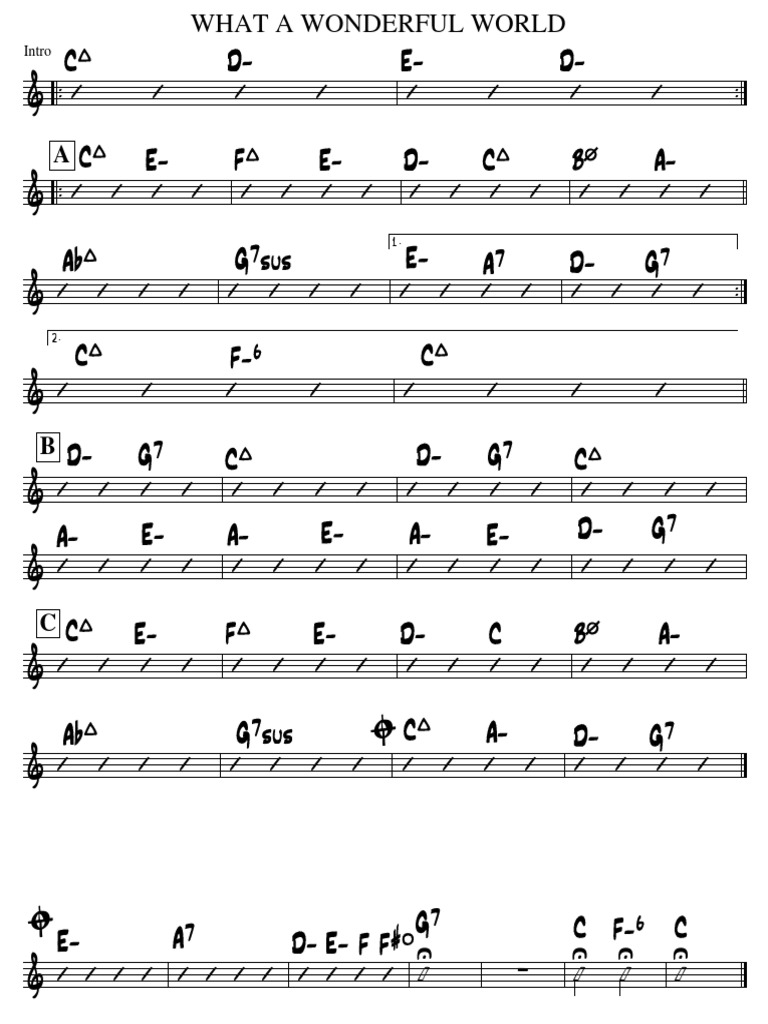 Wonderful World Chord Chart What A Wonderful World Chords Real Book 3,776,341 views, added to favorites 115,265 times. fmaj7 f/ab maj7 f/a gm7 fmaj7 a7 dm7 d maj7 gm7 c7 1. what a wonderful world chords. 2,987,810 views, added to favorites 31,588 times. Fmaj7 f7 5 b maj7 c7 gm7 c7 2. le real book (nommé ainsi par allusion humoristique aux fake books des années 1940 et 1950),. What A Wonderful World Chords Real Book.