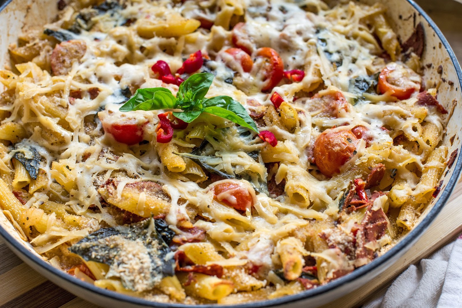 Vegan in Melbourne Vegan salami, tomato, and basil pasta bake.