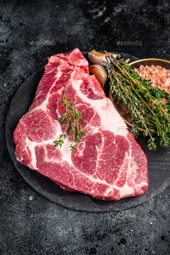 Pork loin steak, raw neck meat with thyme and salt. Black background