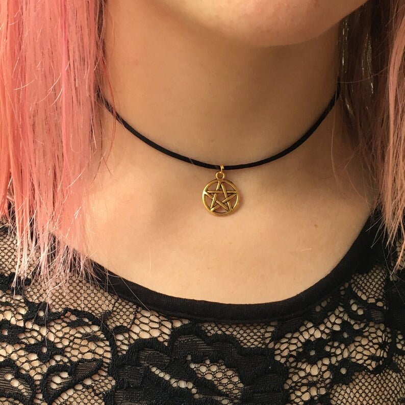 Black Cord Choker Necklace Silver / Gold Pentagram 90s Choker Etsy