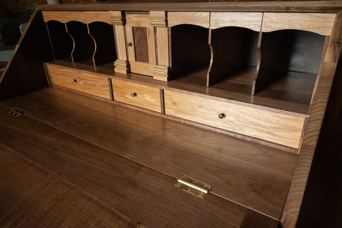 This is a very simple, functional. When the slant top is open one’s eyes are drawn to the contrasting small drawers and pigeonholes. It provides a large work surface and lots of storage too. A complete bill of materials. Storage cubbies help organize letters, stamps and other supplies. From the woodworkers standpoint the gallery provides many options for showing off some finer. In this plan you’ll find: Wood movement is a real concern. The front panel of this secretary desk hinges down to create an instant writing desk. Also called a ‘slant top’ or ‘drop front’ desk, this style of desk offers a great combination of storage space and beauty in a small amount of floor space.