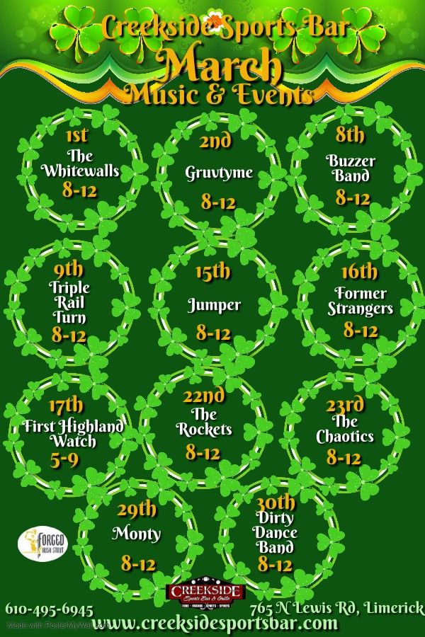 Gruvtyme 3/2, Creekside Sports Bar & Grille, Royersford, March 2 to Creekside Sports Bar & Grille Events There’s more coming, so stay tuned!! Featuring 13 hd tv’s, pool table, 2 phoenix dart machines, and a brand new golden tee machine. Entertainment events by creekside sports bar & grille. Keep on eye on the sports bar area of the site, and check out music & events for the events in the bar. The patio is also in full.. Creekside Sports Bar & Grille Events.