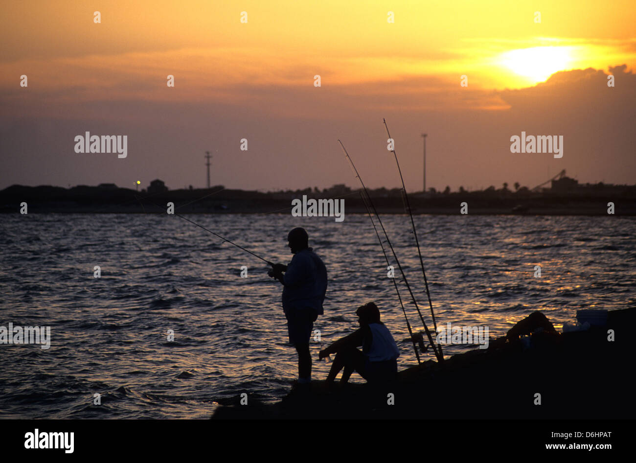 Two people fishing at sunset on the jetties at Port Aransas Texas Stock Photo Alamy