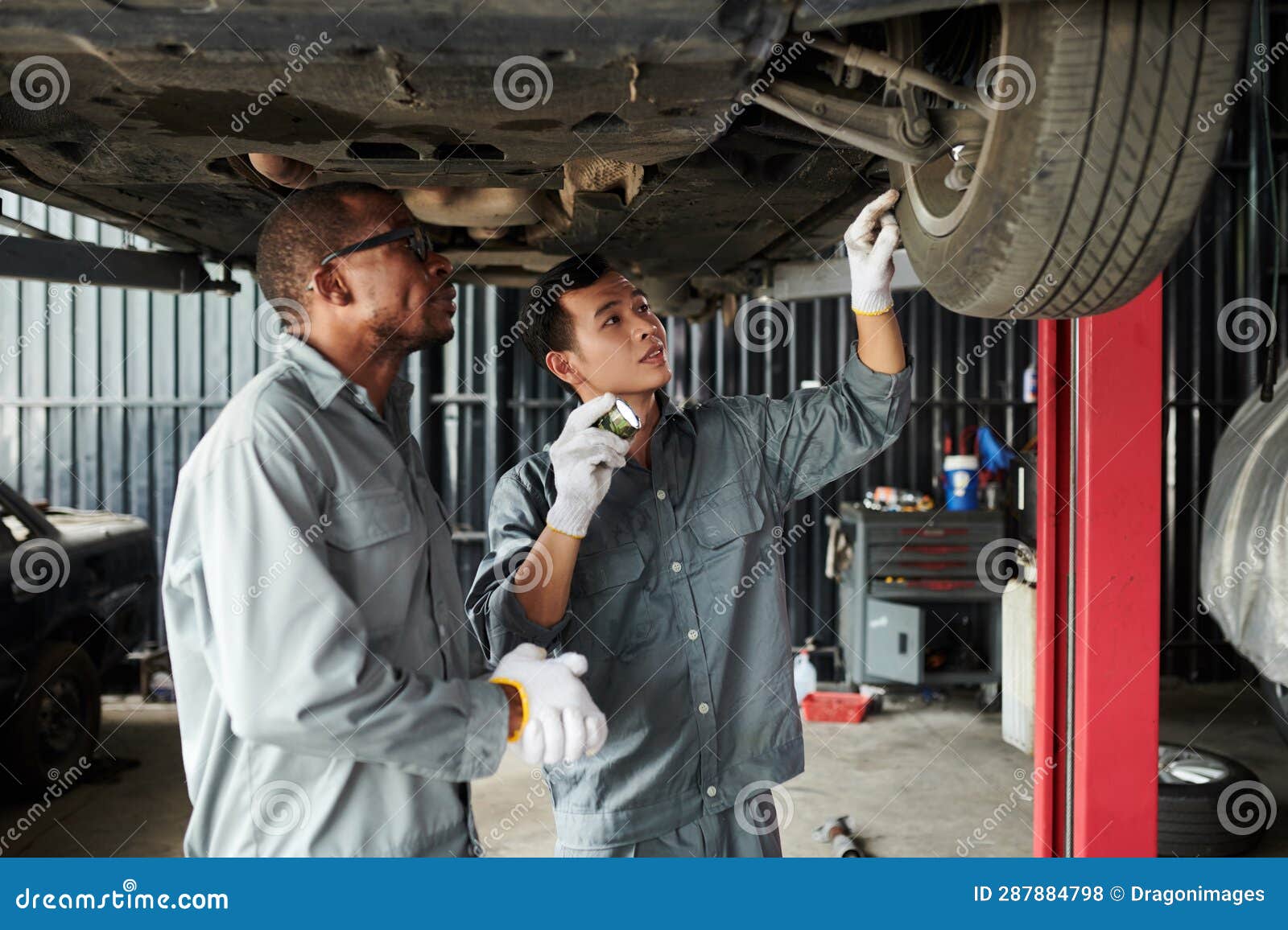 Mechanics Examining Suspended Car Stock Photo Image of repairman