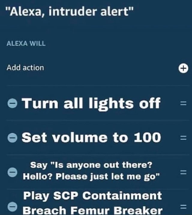 Alexa Intruder Alert Meme Make alexa, intruder alert memes or upload your own images to make custom memes Browse and add captions to alexa, intruder alert memes. 👉 bring your favorite memes into the real world by visiting the meme store! Images tagged alexa intruder alert. See more 'alexa, intruder alert' images on know your meme! It started when someone created a routine that. Alexa Intruder Alert Meme.
