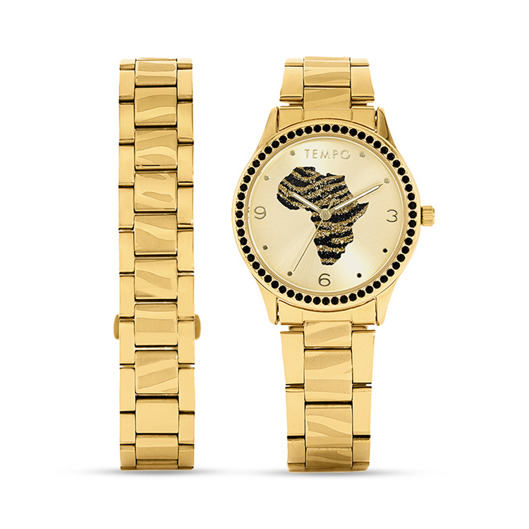 Tempo Women’s Gold Plated Africa Dial Bracelet Watch Set
