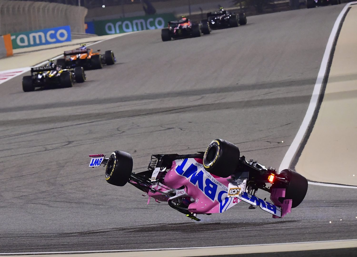 Racing Point driver Lance Stroll flips his car during the Formula One