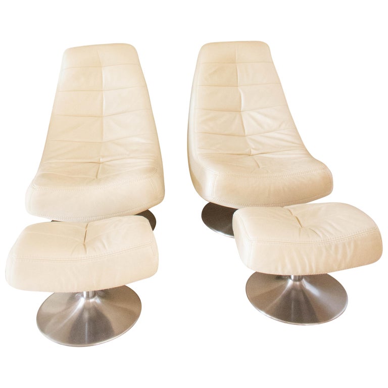 Pair of Cream Leather Lounge Chairs with Ottomans French, circa 1980 at