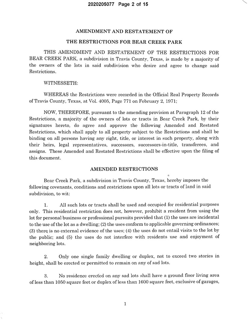 Bear Creek Park ATX Updated Deed Restrictions