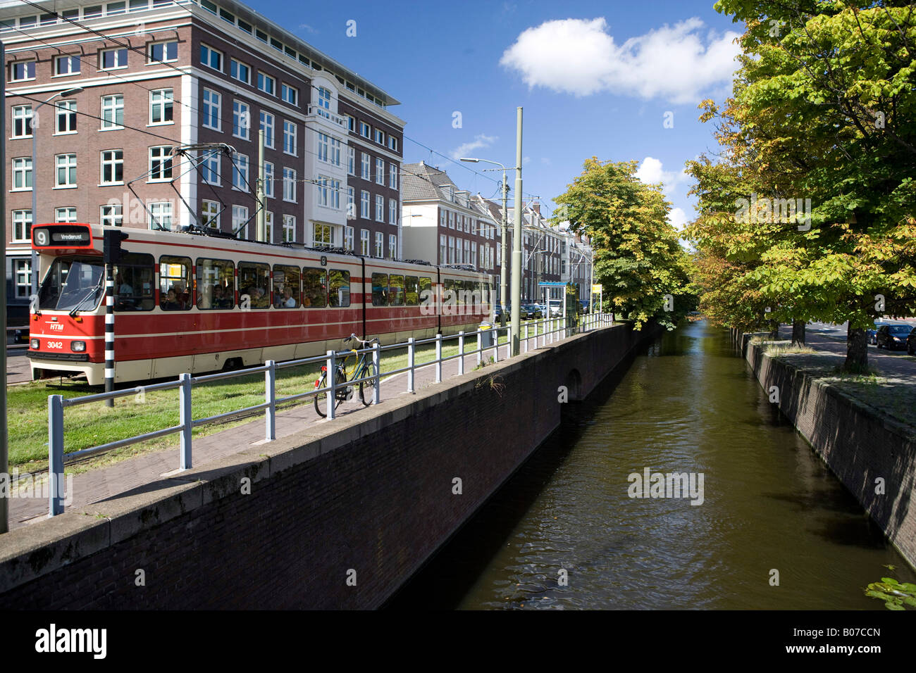 View of a Tram running by the side of a canal in the City of Den Haag