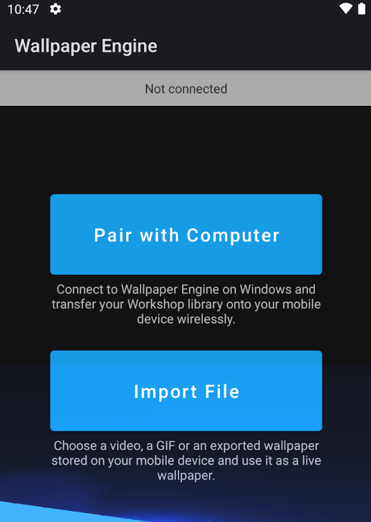 How To Use Wallpaper Engine On Mobile With the free wallpaper engine android companion app, effortlessly sync your favorite wallpapers from your computer to your mobile device. You can pair your mobile devices with your computer to wirelessly transfer your wallpaper collection to the wallpaper engine companion. Download the free wallpaper engine android app and wirelessly transfer your existing wallpaper engine collection to. Explore our guide on using wallpaper engine's android app to transfer your favorite wallpapers from pc to mobile, enhancing your digital experience. With the free wallpaper engine android companion app, effortlessly sync your favorite wallpapers from your computer to your mobile device. How to connect wallpaper engine to mobile (full guide)bring your desktop wallpapers to life on your mobile device with our comprehensive. This video will help you to download the wallpaper engine app on android.