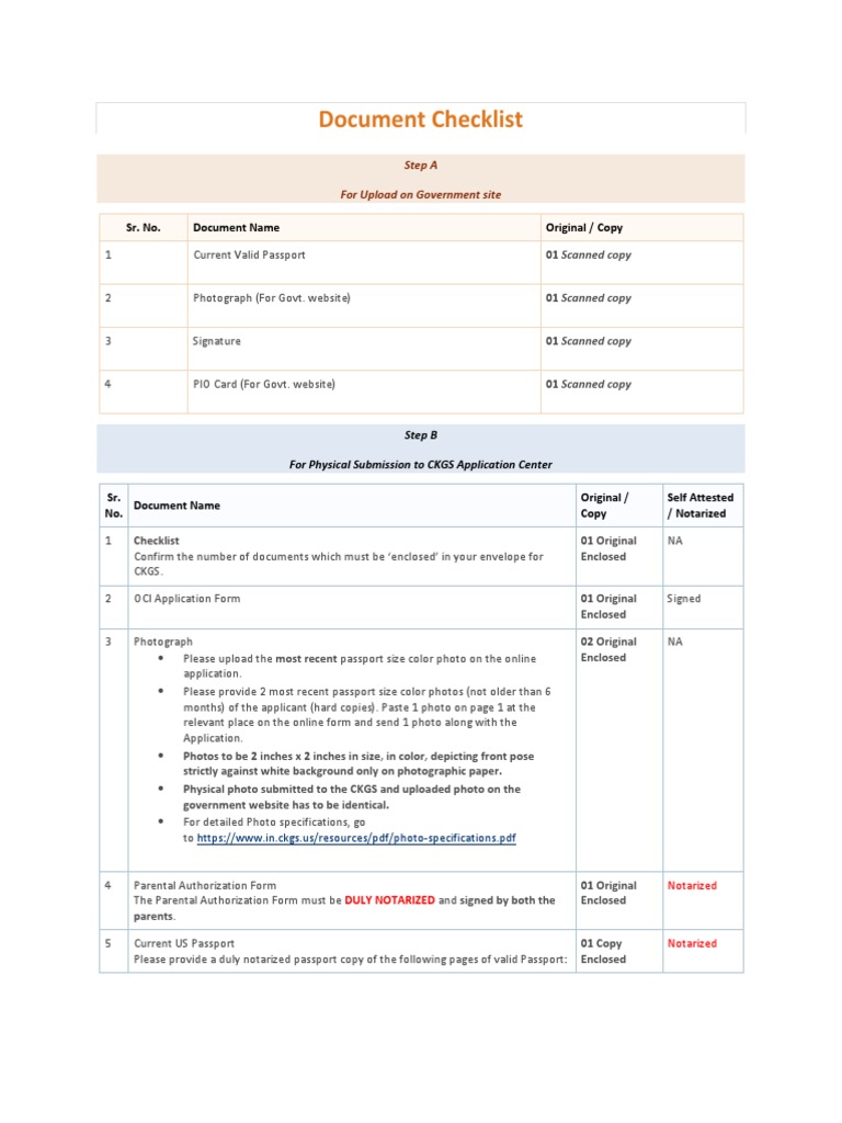 List Of Documents For Oci The following is a list of documents /checklist to be submitted, along with your application for an oci card. The following is a list of documents to be submitted for applying for new oci for minor applicant. Only the attested declaration from the consulate should be enclosed along with the nativity certificate or domicile certificate. Any of the following documents may be provided: The following is a list of documents /checklist to be submitted, along with your application for an oci card. • copies of indian passports • copy of the domicile certificate issued by the competent authority •. List of original documents required with oci application the following is a list of basic documents to be submitted in cases. You need to mail this checklist.