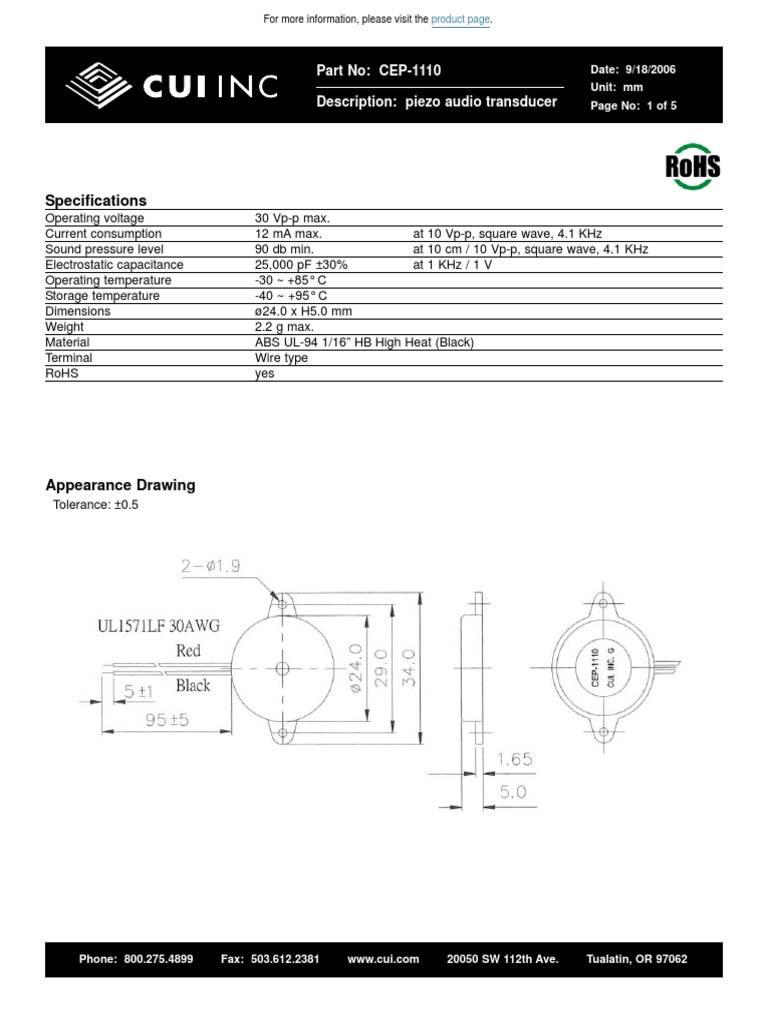 CEP1110 Datasheet Piezo Audio Transducer _ CUI Inc Microphone