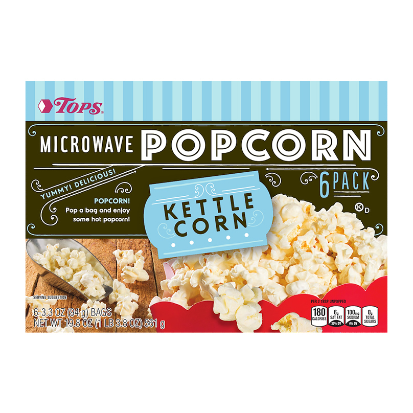 Tops 6 Pack Kettle Corn Microwave Popcorn 3.3 oz Buttery Kettle Corn Microwave Popcorn Microwave popcorn ready in only 2 minutes; Salty, sweet and buttery flavors combine in each delicious bite of microwave kettle corn; Keep your pantry stocked with this savory microwave kettle corn, made with 100% whole grain popcorn kernels and 0 grams of trans fat. Serve a salty sweet snack after school with act ii microwavable. Made with 100% whole grain. Buttery Kettle Corn Microwave Popcorn.