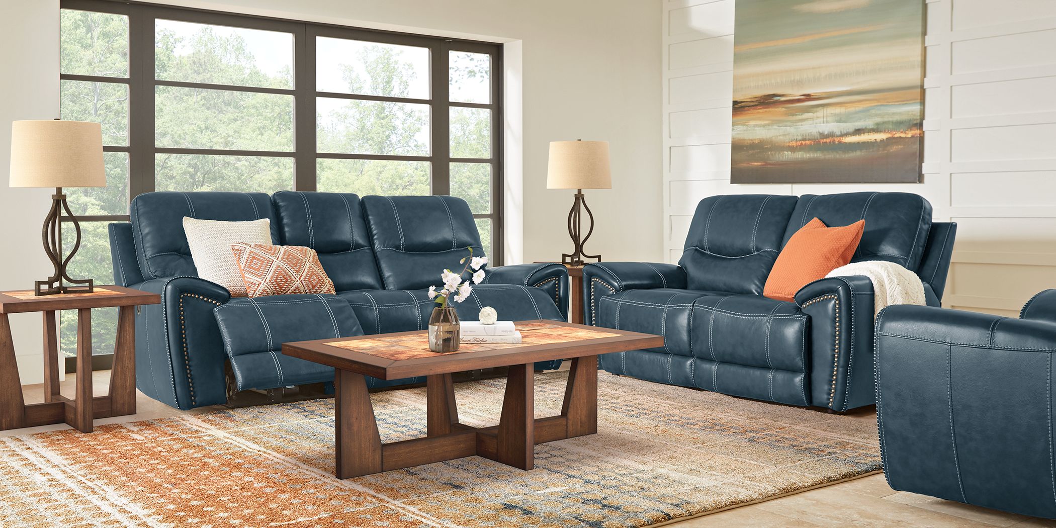 Italo Blue Leather 7 Pc Living Room with Reclining Sofa Rooms To Go