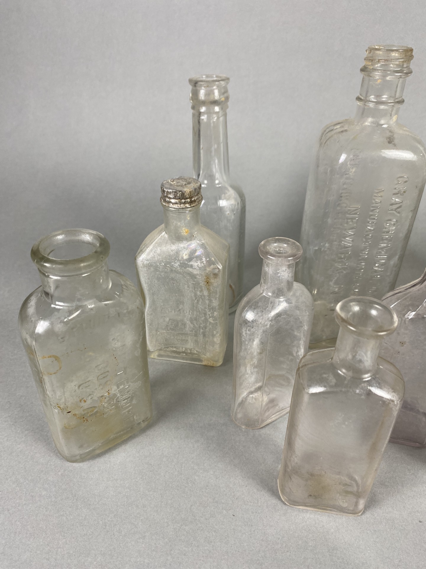 Many Vintage Glass Bottles In Different Shapes & Brands Including Gray