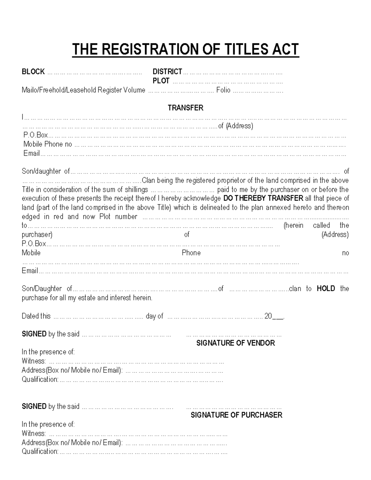 Land Transfer forms 2015 THE REGISTRATION OF TITLES ACT BLOCK Studocu