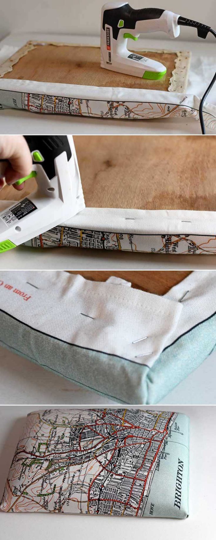 How To Reupholster A Footstool With A Tea Towel Pillar Box Blue
