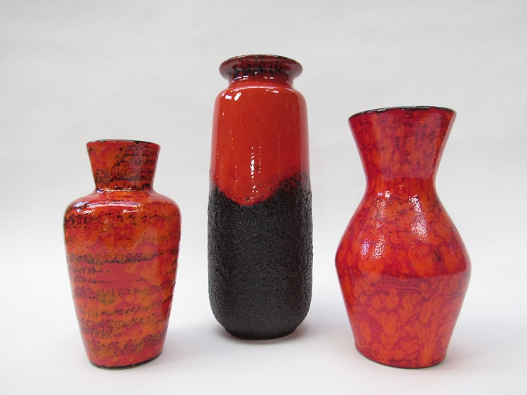 Three West German orange Lava vases with black, various shapes, 52321