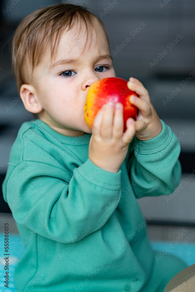 Little baby eating apple. Portrait of a happy little boy with red