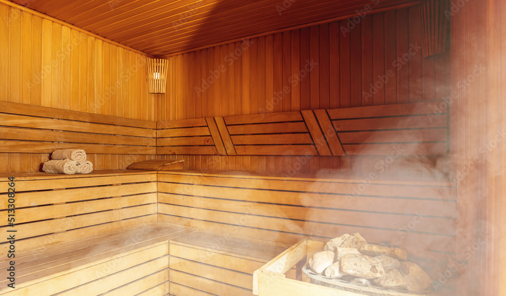 Interior of Finnish sauna, classic wooden sauna with hot steam. Russian