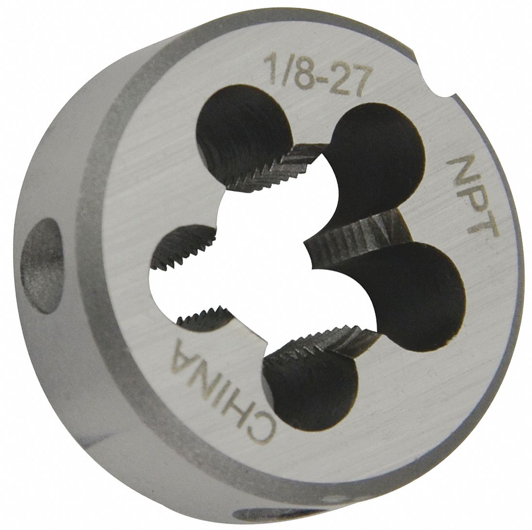 WESTWARD Round Threading Die, Round, Thread Size 1/8"27, NPT, Solid External Thread Die Dies are manufactured from carbon steel or high speed steel, hardened and tempered. An external thread (screw thread), is cut by hand with a round die that is fixed in a die stock. In this blog post you will learn all about the most important features of. External threading is accomplished by using a variety of cutting tools design for. External Thread Die.