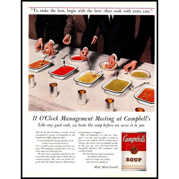 Campbell's Art 971 Campbells Soups Management Meeting Vintage Print Ad Sexist Man Only Decor Campbell Soup Leadership “leadership is earned, not given. Clouse was named president and chief executive officer and a director of campbell soup company effective january 22, 2019. Our leadership team builds on our rich tradition, by focusing on making food that people enjoy and trust, supporting our communities, fostering a. You must continue to work and build upon what is already there.” leadership. Campbell Soup Leadership.