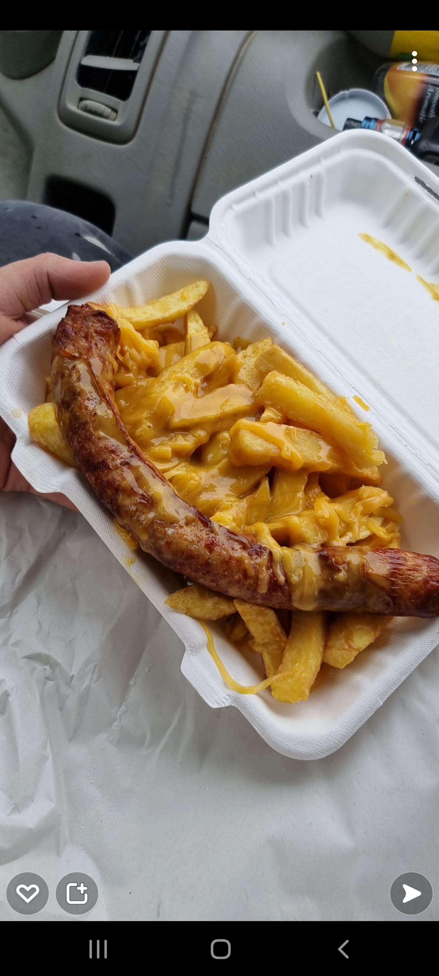 Cumberland sausage, chips, cheese and curry sauce r/RateMyPlate