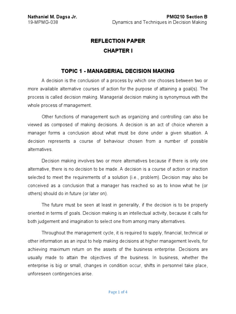 Reflection Paper Decision Making Chapter 1 PDF Decision Making