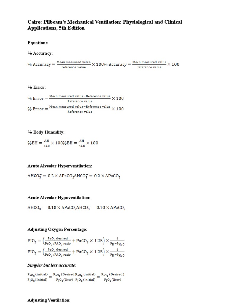 Respiratory Formulas, Calculations, and Equations Respiratory Therapy Respiratory Therapy Equations Study with quizlet and memorize flashcards containing terms like alveolar oxygen pressure (pao2) equation, %body humidity, %relative. The equation of motion for inspiration can be written as follows: Pmus + pvent = rxv̇ + exv + po + inertance [1] pmus = pressure generated by the inspiratory muscles. This chapter is most relevant to section f9(iii) from the 2023 cicm. Respiratory Therapy Equations.