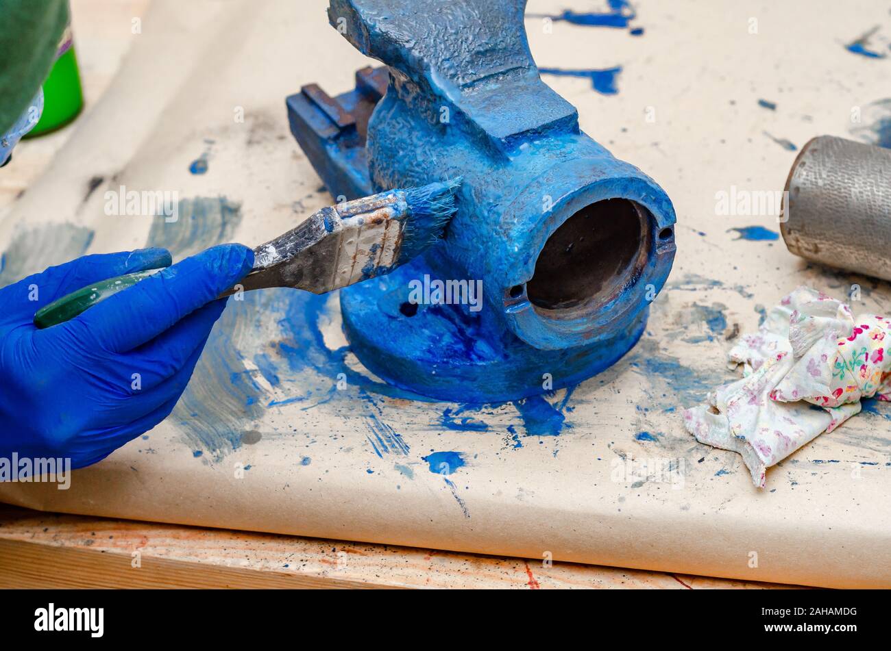 Worker paints a metal vise with blue paint. Stripping old paint Stock