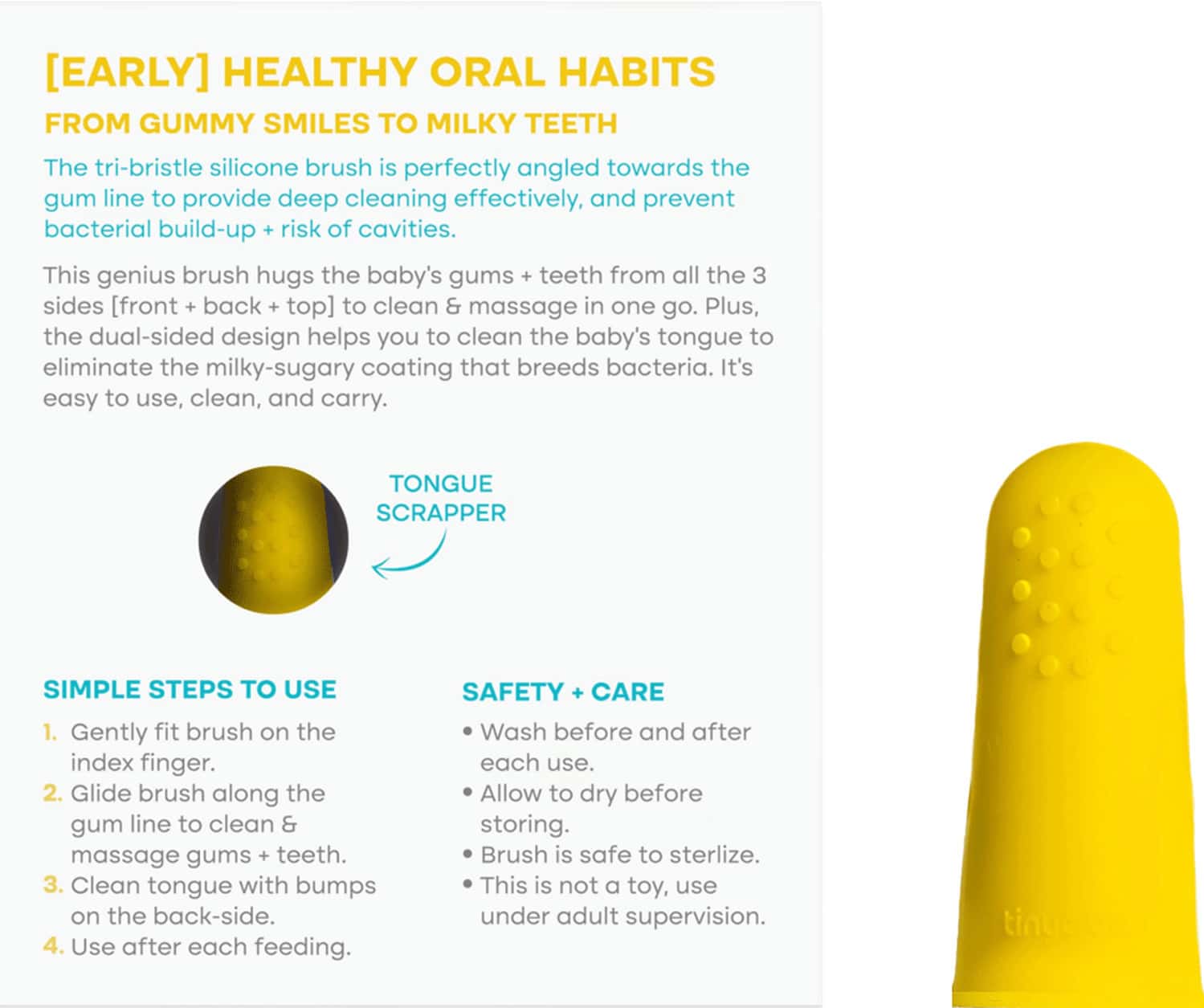 Finger Brush For Babies Getting a toothbrush in (or out of) your baby’s mouth can be a nightmare, but our finger toothbrushes make oral hygiene easy. Easy to use and clean: The smilefrida finger brush makes it easy to clean your squirmy little one’s baby teeth, without losing your sanity. Silicone bristles gently clean baby’s gums and emerging teeth. Finger toothbrush provides oral care. Finger Brush For Babies.