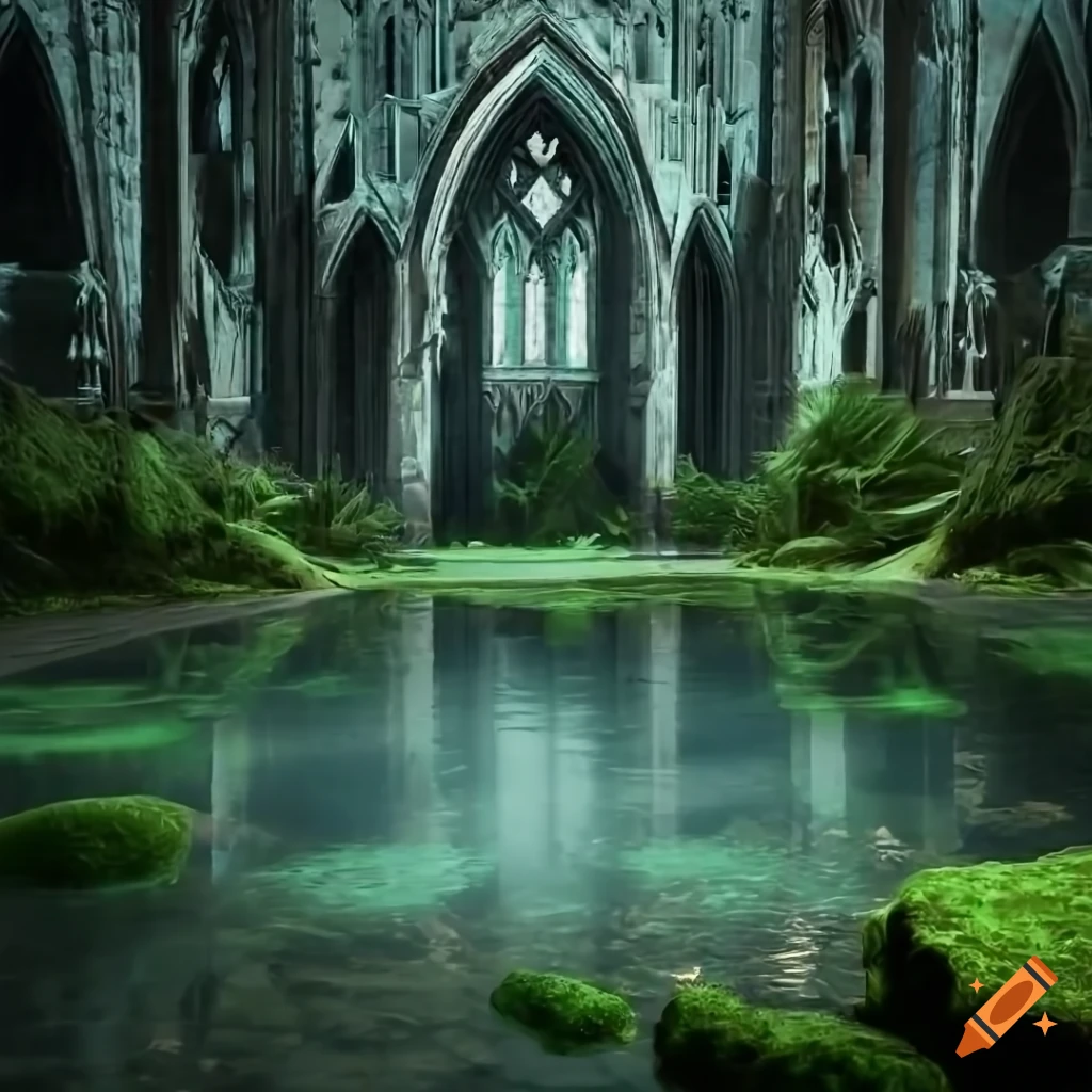 A mystic cathedral filled with crystals, pond, lush vegetation, stone