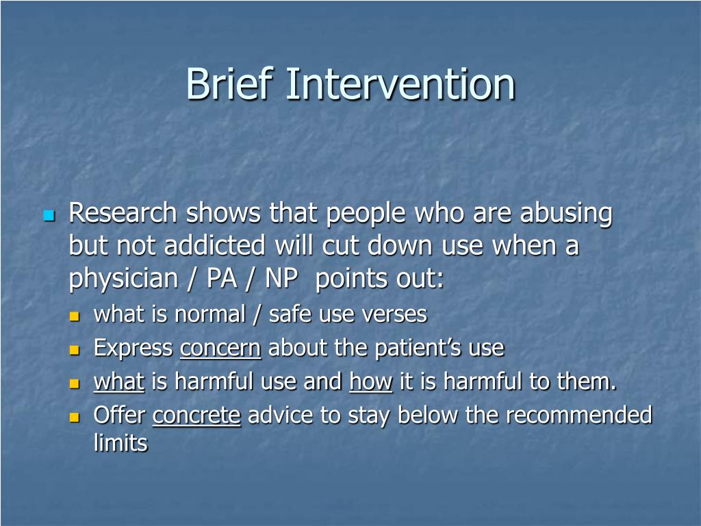 PPT Screening, Brief Interventions, Referral and Treatment (SBIRT Types Of Brief Interventions A brief intervention involves oral discussion, negotiation or encouragement, with or without written or other. This guideline makes recommendations for the use of psychosocial interventions in the treatment of people who misuse opioids, stimulants and. Explore brief intervention therapy's key components, applications, and effectiveness in promoting rapid behavioral change across. Brief interventions with this group address the level of use,. Types Of Brief Interventions.