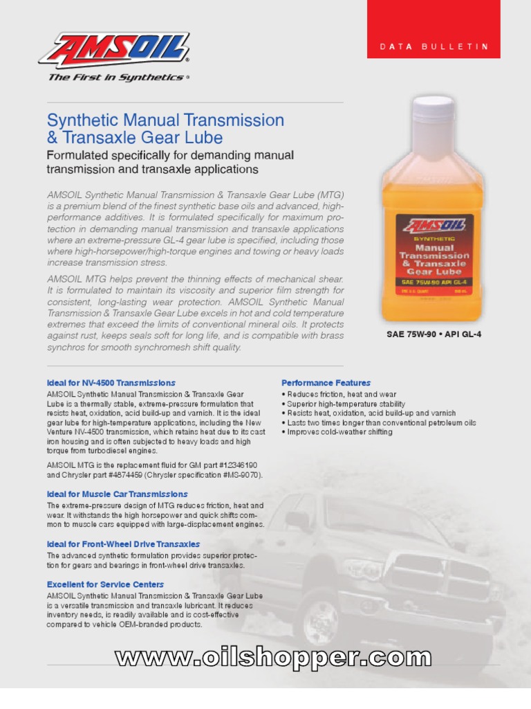 AMSOIL MTG 75w90 Fully Synthetic Gearbox Oil The Courtenay Sport Blog Manual Transmission & Transaxle Gear Lube 75W-90 This synthetic lubricant is designed to meet the special requirements of certain manual transmissions and transaxles, such as the new venture nv4500. Manual Transmission & Transaxle Gear Lube 75W-90.