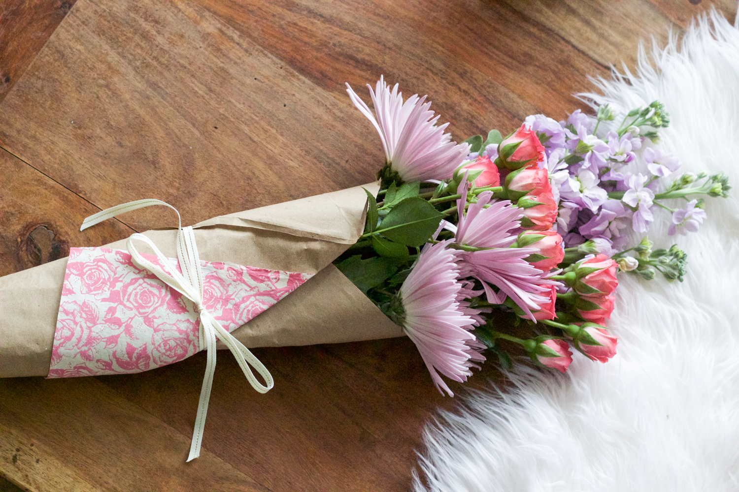 How to Wrap a Flower Bouquet The Things She Makes How To Wrap Supermarket Flowers Transform supermarket flowers with this simple flower wrap diy that will style up a beautiful bunch of flowers in minutes! Learn how to wrap flowers in kraft paper, newspaper, napkin or tissue paper with ribbon or yarn. Learn how to wrap flowers and transform a few inexpensive assortments (most grocery stores have bundles of flowers for $5. Rather than splurging. How To Wrap Supermarket Flowers.