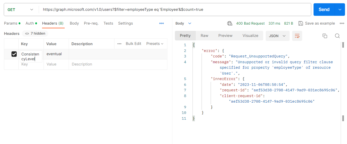 Unable to filter using advance query capabilities in Microsoft Graph
