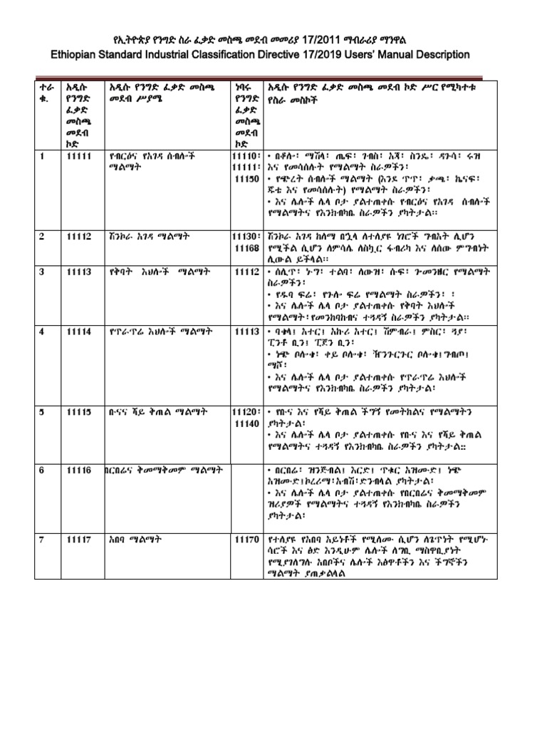 Business licensing categories in order to effectively implement the redesigned business process the requirements for trade licensing. Standard international trade classification /sitc/ • sitc ማለት በውጪ ንግድ ውስጥ የተለያዩ ትንተናዎች ለመስጠት የሚረዳ የምርቶችን ዝርዝር የያዘ ሰነድ ነው። Scribd is the world's largest social reading and publishing site. It divides economic activities into 10 major sectors like agriculture, mining,. Requirements for trade licensing shall be prepared based on the ethiopian standard industrial classification, (esic) as adapted from the. This document outlines ethiopia's standard industrial classification system (esic) for business licensing categories. 1 የኢትዮጵያ የንግዴ ስራ ፈቃዴ መስጫ መዯብ መመሪያ ቁጥር 17/2011 በንግዴ ስራ የተሰማሩ ነጋዳዎችን ተዯራሽ በማዴረግ ሇክትትሌ አሰራር ምቹ ሁኔታዎችን 4 12.ምህጻረ ቃላቶች የንግድና ኢንዱስትሪ ሚኒስቴር ን/ኢ/ሚ የክልል ንግድ መስሪያ ቤት ክ/ን/መ/ቤት