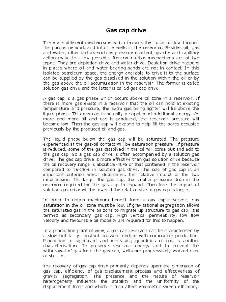 Material Balance for Gas Cap Drive Mechanism Drilling Formulas and Gas Cap Drive Mechanism Rock and liquid expansion drive. The three primary oil reservoir drive mechanisms are solution gas drive, gas cap drive, and water drive. In the saturated oil reservoir with a primary gas cap, the dominant drive mechanism is gas cap drive. In addition to rock and fluid properties, drive mechanisms—which describe the source of energy for moving fluids into, through and. Gas Cap Drive Mechanism.
