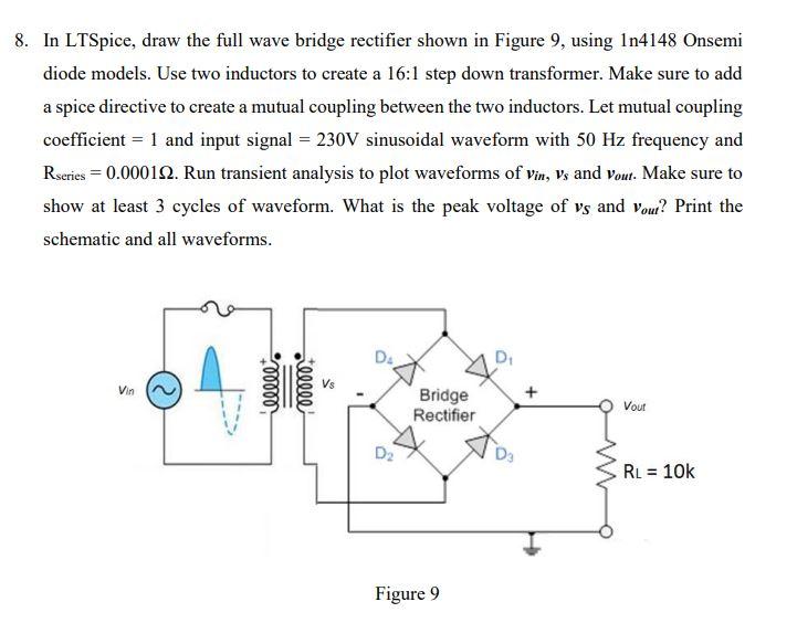 Solved 8. In LTSpice, draw the full wave bridge rectifier