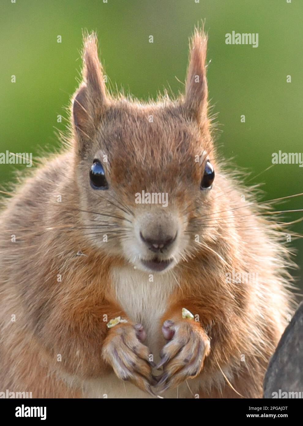 Close up of an endangered red squirrel, sciurus vulgaris, from the front showing detail of face