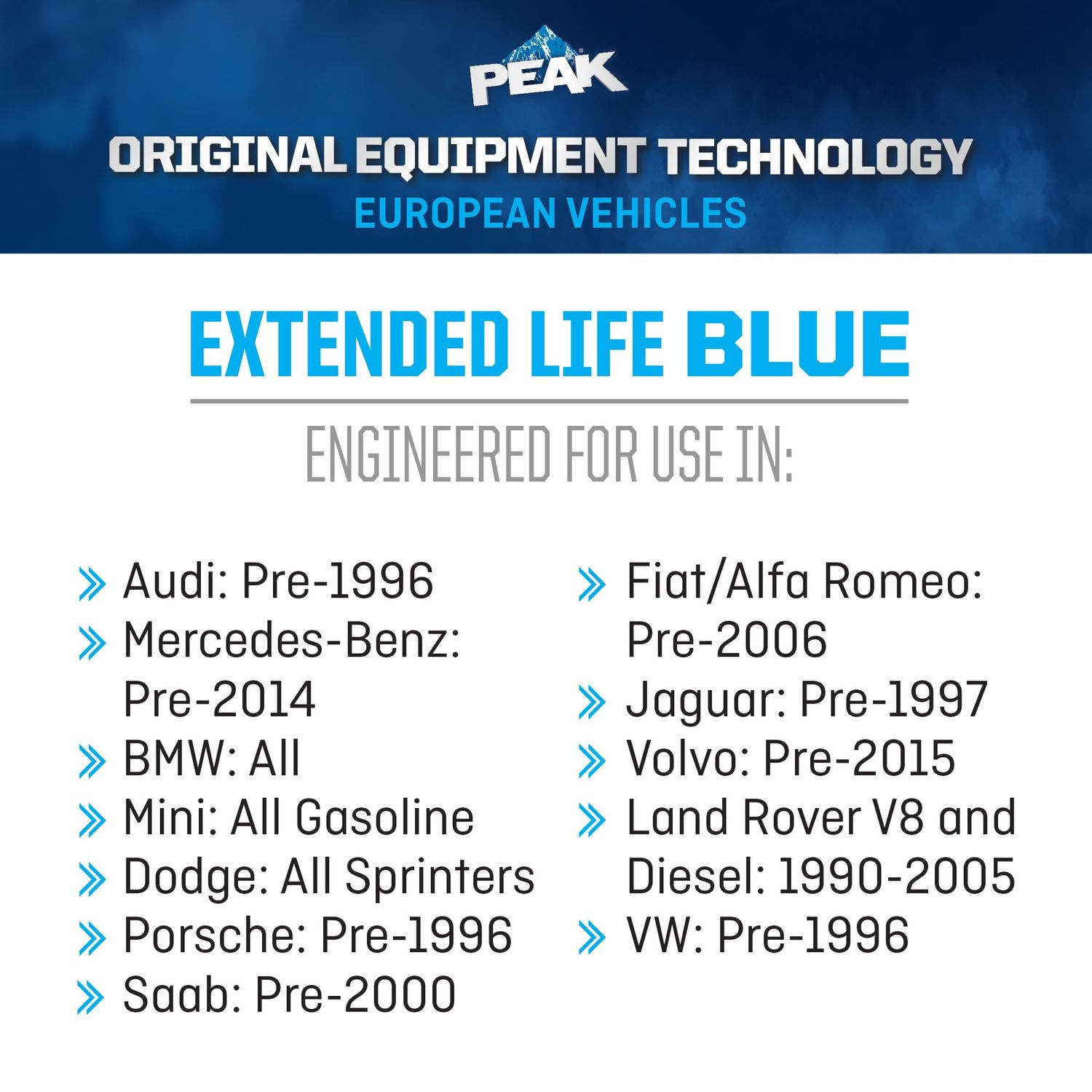 PEAK Original Equipment Technology European Vehicles Blue Antifreeze and Coolant ReadyToUse European Vehicle Coolant Keep your bmw, mercedes, vw or audi running cool and protected with napa european vehicle oe european blue antifreeze & coolant. Peak original equipment technology™ european vehicles antifreeze + coolant. Peak original equipment technology antifreeze + coolant is specifically designed for european vehicles requiring a blue coolant, and is formulated with the same silicate. Advanced formulation prevents rust & corrosion. European Vehicle Coolant.