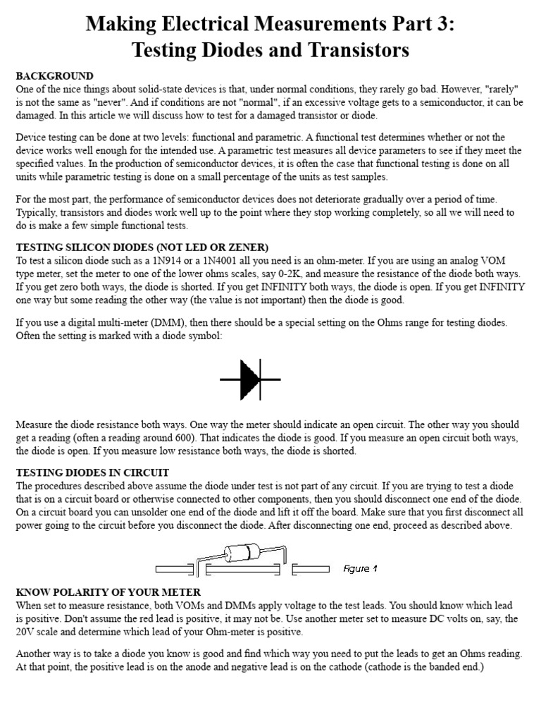 Making Electrical Measurements Part 3 Testing Diodes and Transistors Diodes And Transistors Pdf Invention of transistor and birth of modern electronics. Diode allows current to pass in only one direction. This book discusses the features and applications of the fundamental semiconductor devices such as diodes, bipolar junction transistors, junction field effect transistors, metal oxide. John bardeen, william shockley and walter brattain. Protect circuits by limiting the voltage (clipping and clamping) turn ac into. Diodes And Transistors Pdf.