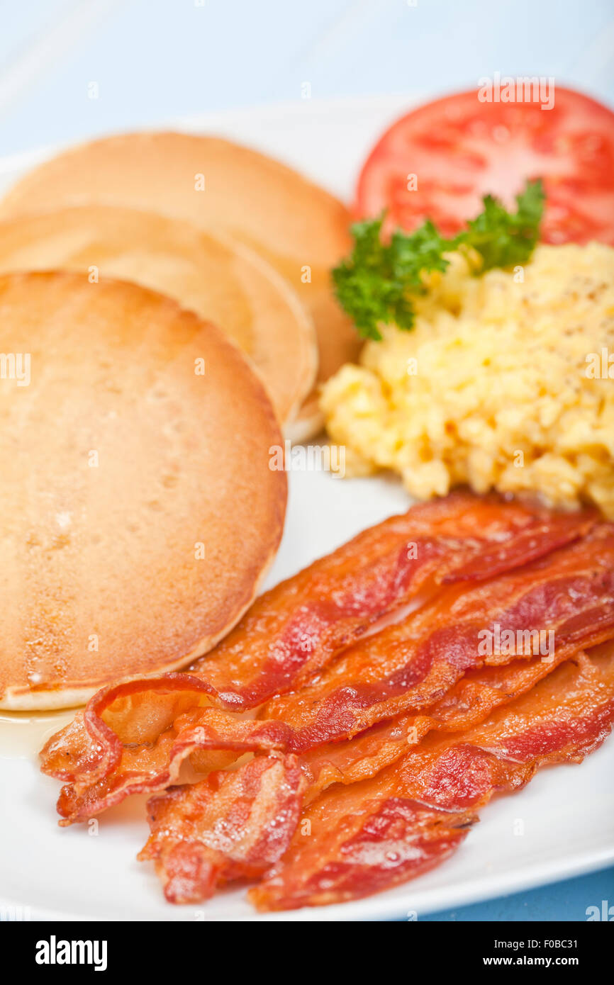 American style breakfast of pancakes, bacon and eggs Stock Photo Alamy
