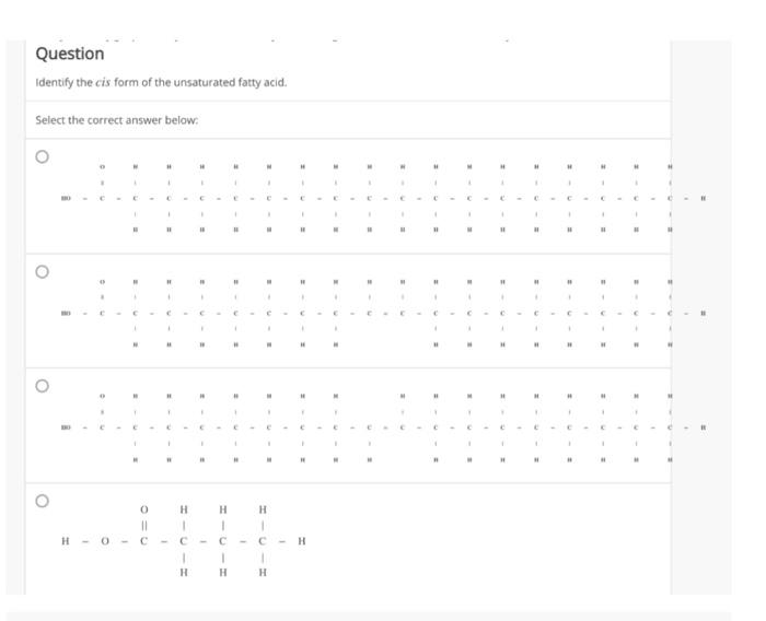 Solved Question Identify the cis form of the unsaturated Identify The Cis Form Of The Unsaturated Fatty Acid. Select The Correct Answer Below unsaturated fats or oils are usually of plant origin and contain cis unsaturated fatty acids. Choose the correct answer for the following description: naturally occurring fatty acids are generally in the cis configuration. saturated fats are saturated with. Identify the cis form of the unsaturated fatty acid. select the correct answer below: 【solved】click here to. Identify The Cis Form Of The Unsaturated Fatty Acid. Select The Correct Answer Below.