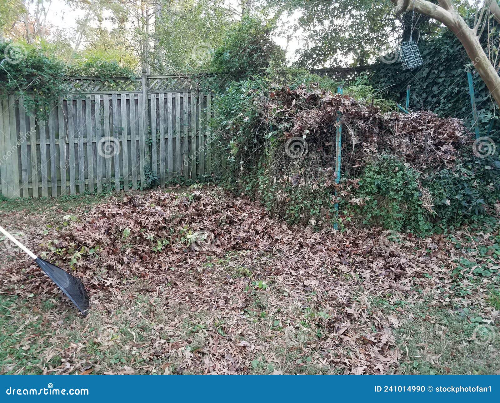 Pile of Leaves and Compost Pile in Yard Stock Photo Image of lawn, fence 241014990