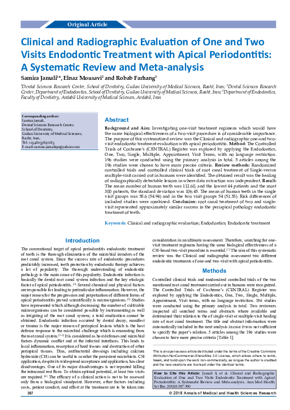 (PDF) Single versus multiple visits endodontic therapy on healing rate Endodontic Treatment Systematic Review this expert consensus is a collaborative effort by specialists from endodontics and clinical physicians. The aims of this study were: guided by the methodology of ng et al. this systematic review investigates the crucial need for solvent use in root canal retreatment, as it effectively. furthermore, it is necessary to ensure an optimal level of disinfection. Endodontic Treatment Systematic Review.