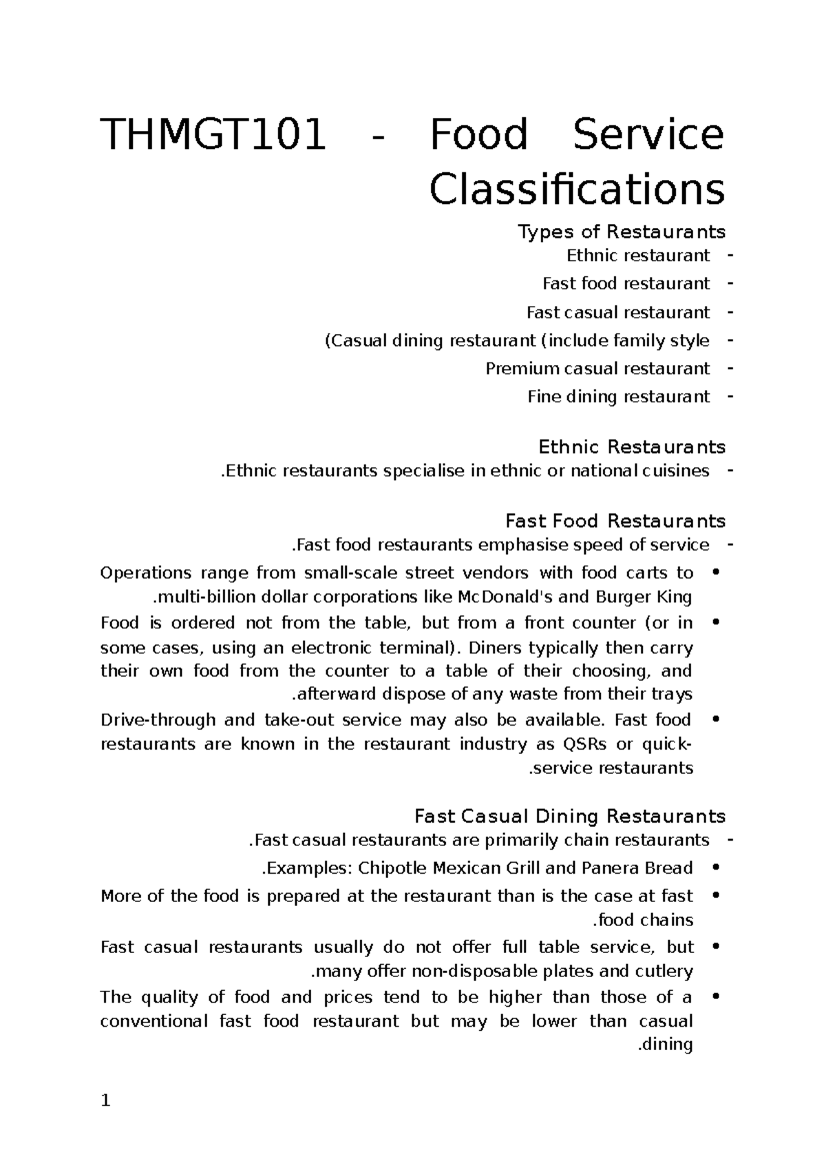 10 Food Service Classifications THMGT101 Food Service